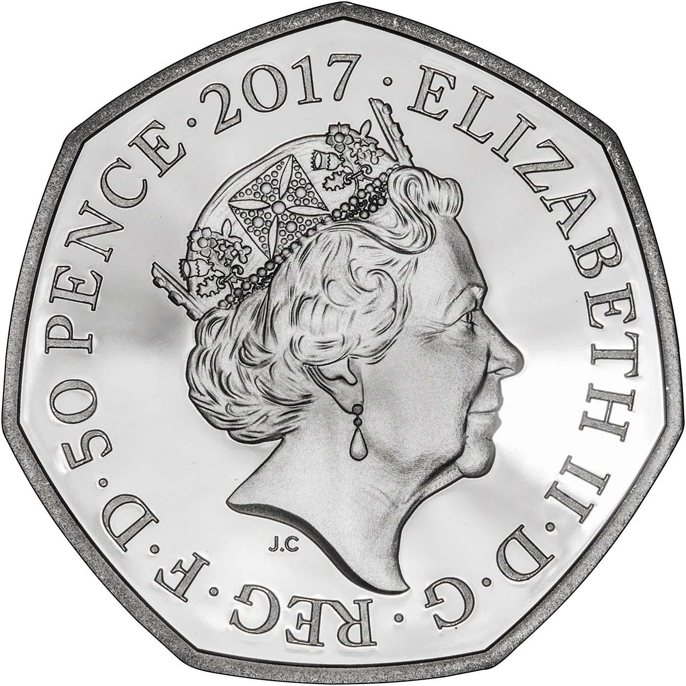 The Beatrix Potter Anniversary 50p marked the 150th anniversary of the birth of Beatrix Potter in 2016. The design by Emma Noble centres on the text BEATRIX POTTER and the dates she lived 1866-1943. There is also a small silhouette of the author above, Peter Rabbit running below and growing plants on each side. The fifty pence piece is circulated and protected in a small plastic wallet.