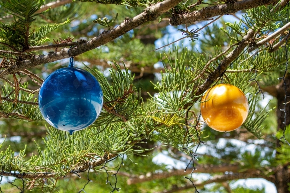 Image of Giant Christmas baubles and decorations on tree. Austockphoto
