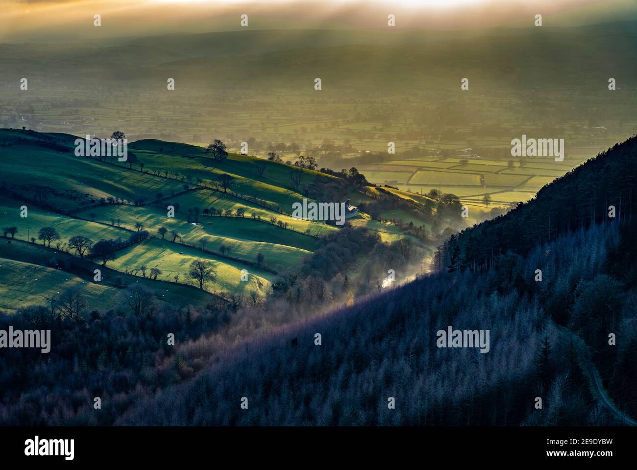 Glowing green fields with long shadows of trees , Llangwyfan, Penycloddiau Stock Photo Alamy
