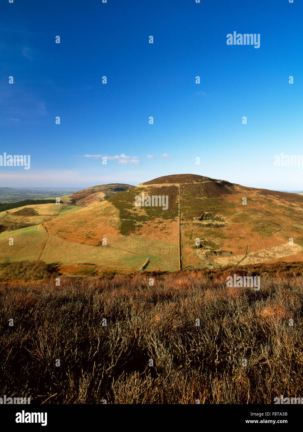 View NW from Moel Llysycoed to circular rampart of Moel Arthur hillfort with Penycloddiau