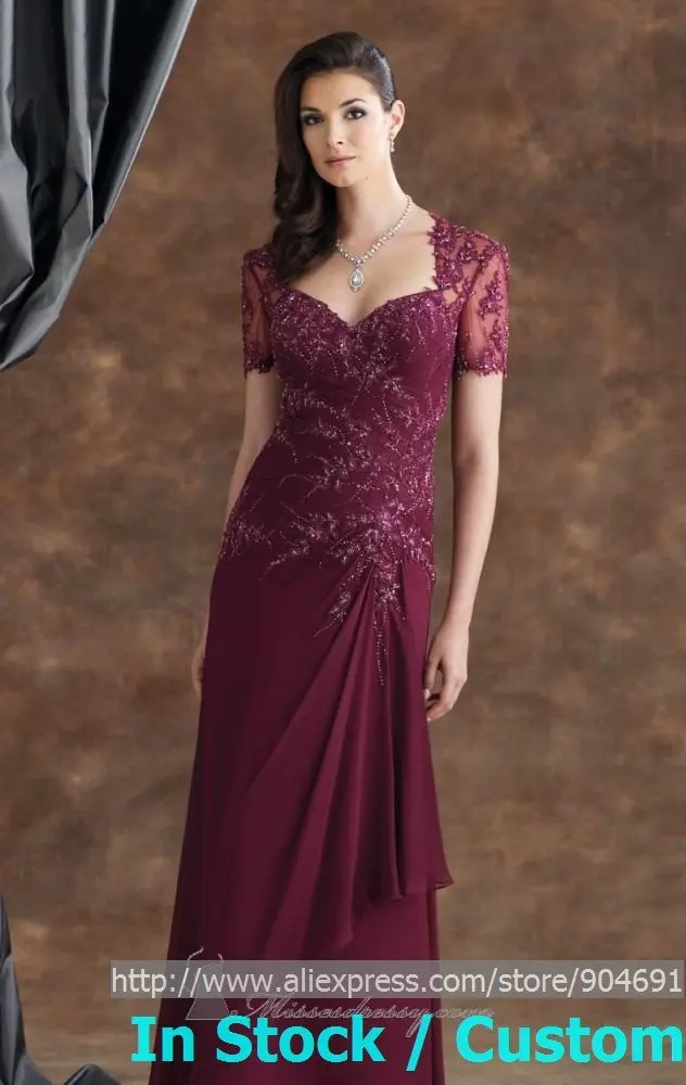 Burgundy Lace Short Sleeves Mother of the Bride Dress Red Wine Chiffon Long Evening Dress