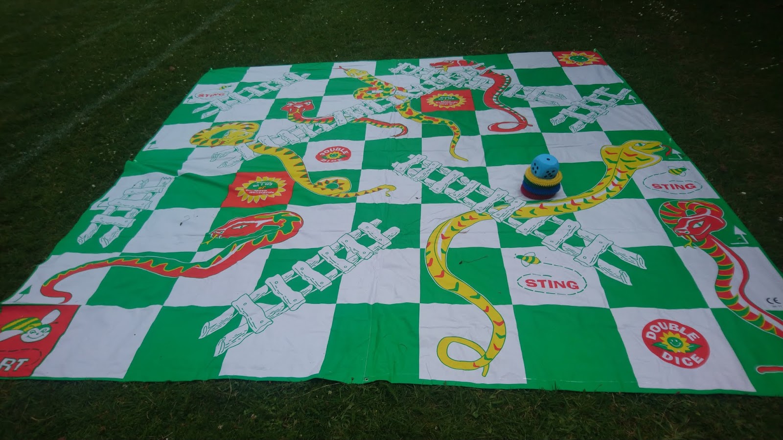 This game is played on a giant mat measuring 3 x 3 m (approximately 10 x 10 feet). Perfect for kids of all ages, from 5 - 95! What's Included: 3m x 3m square Snakes & Ladders Mat, 1 giant inflatable die, 8 pegs for securing the mat (for use on grass or other soft surfaces) and Cotton Carry Bag.